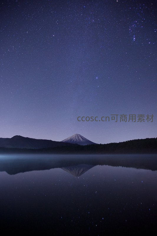 夜幕低垂,富士山雪顶轮廓清晰,矗立于深蓝天幕下;头顶繁星密布,银河隐约可见;山前湖泊平静无波,完美倒映山形与星光,薄雾轻笼水面,营造出空灵静谧的东方意境,体现自然与宇宙的和谐之美。