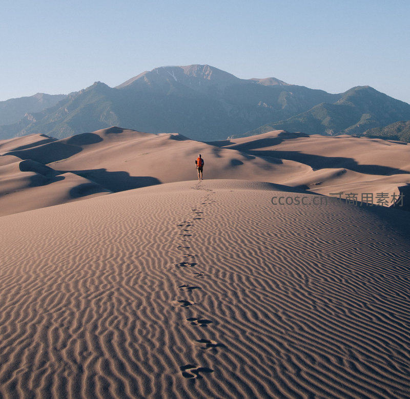 孤独旅人踏沙而行,连绵沙丘与远山构成壮阔自然画卷