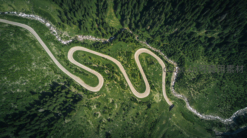 高空俯瞰视角下,一条S形盘山公路蜿蜒穿梭于茂密针叶林覆盖的山谷中,清澈溪流沿路平行流淌,阳光洒落形成明暗交错的光影层次,展现壮丽而宁静的自然生态景观。