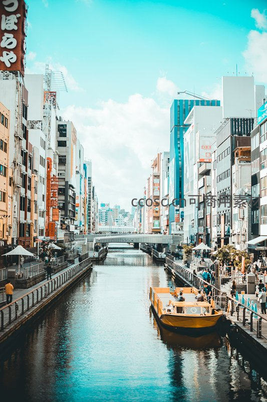 晴朗日光下,一条狭长运河贯穿密集都市街区,橙色观光船悠然行驶于碧绿水道,两岸林立现代高楼与传统招牌并存的店铺,行人漫步河岸,展现东京融合传统与现代的独特水岸魅力。