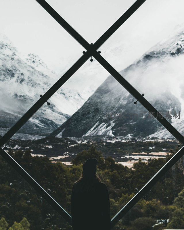 一人背影立于黑色菱形金属框架内,凝望远方层叠雪峰与薄雾笼罩的山谷;前景结构强化纵深感,冷色调光影营造沉静哲思氛围,体现人与自然的敬畏与对话。