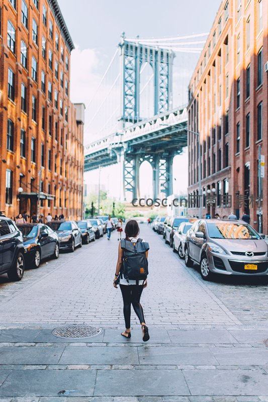 阳光洒落的纽约布鲁克林老街,一位背着双肩包的女性沿石板路前行,两侧红砖仓库林立,远处曼哈顿大桥雄伟横跨,构成经典都市人文与工业景观交融画面。