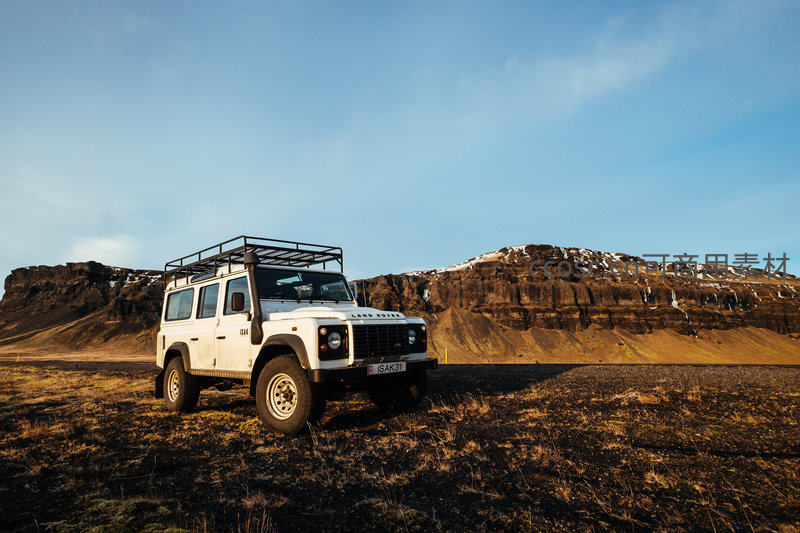 冰岛火山地貌中白色越野车静停荒原,远山覆雪,孤寂壮美