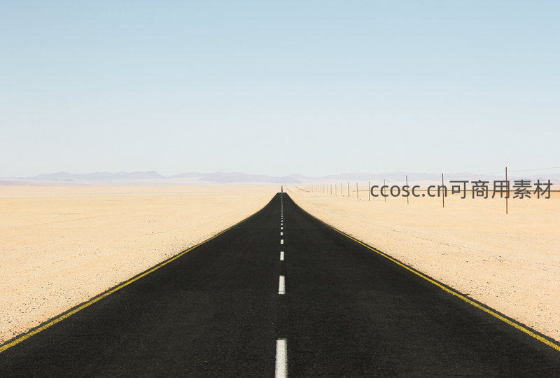 沙漠中笔直延伸的柏油路通向远方地平线,两侧黄沙无垠,天空澄澈