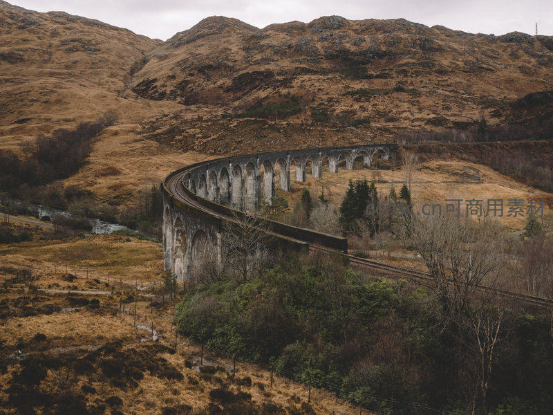 格伦芬南高架桥蜿蜒穿越苏格兰高地褐色荒原,21座石拱结构在枯黄草甸与稀疏林木间矗立,阴云下色调沉郁,彰显维多利亚时代工程奇迹与苍凉自然的和谐共存。
