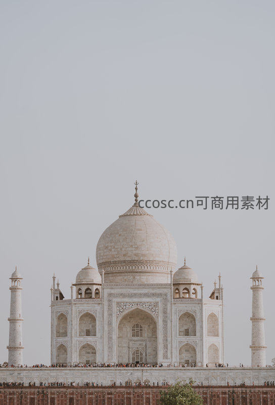 印度阿格拉的泰姬陵正面全景,纯白大理石主体在柔和天光下呈现温润质感,中央大穹顶与四座尖塔构成经典对称布局,基座上游客如蚁群点缀,彰显其世界级文化遗产的永恒魅力与人文气息。
