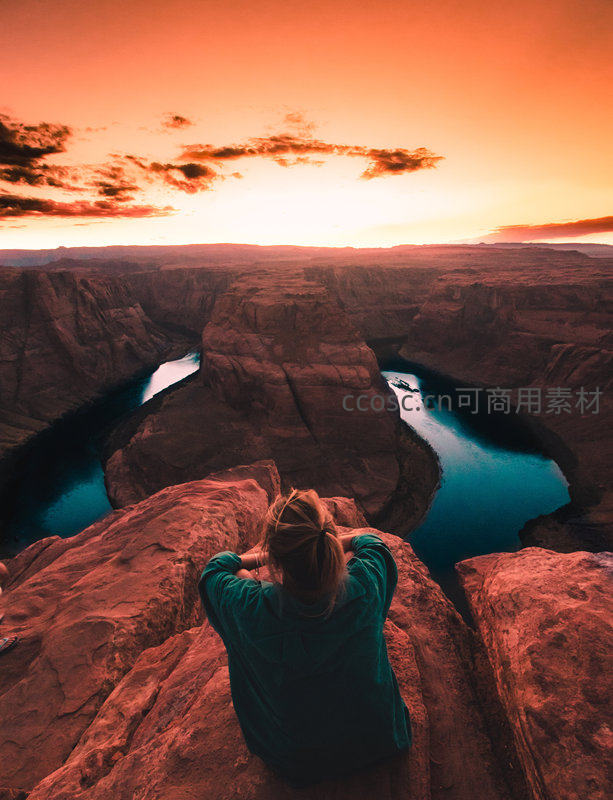 美国亚利桑那州马蹄湾日落黄金时刻,一位游客背坐红色砂岩崖顶,凝望U形深谷中碧蓝河水蜿蜒穿行于赭红色层状岩壁之间,云霞染天,光影交错,展现壮丽地质与人文静思的和谐瞬间。