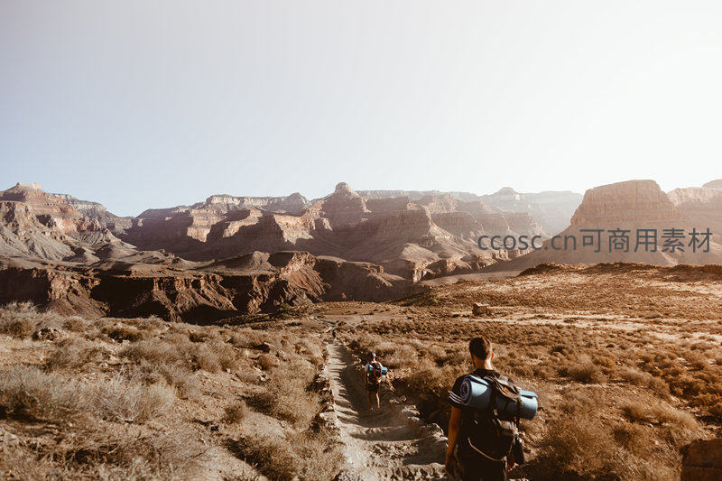 徒步者背负行囊行走在大峡谷边缘土径,远眺层叠岩层与苍茫荒野