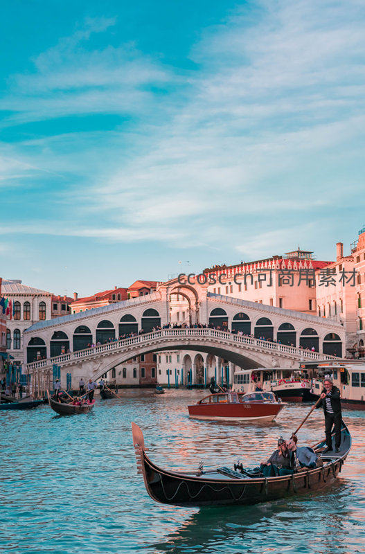 夕阳余晖洒在威尼斯运河水面,经典石拱叹息桥横跨其上,数艘贡多拉载着游客缓缓穿行,船夫撑篙姿态优雅,两岸彩色老建筑倒影摇曳,尽显水都浪漫与历史韵味。