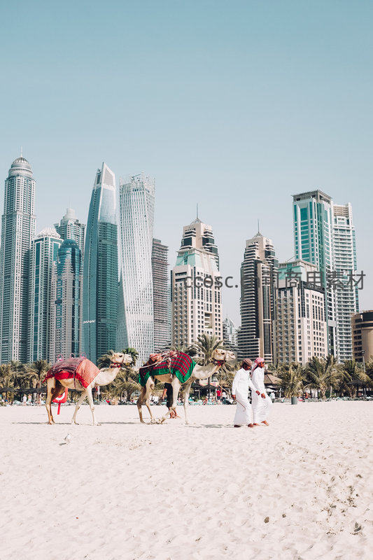 迪拜朱美拉海滩骆驼巡游:现代摩天楼群前传统驼队与白衣行人相映成趣