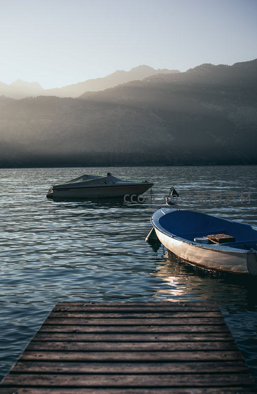 晨光中的湖面小艇与木码头,远山朦胧光影柔和