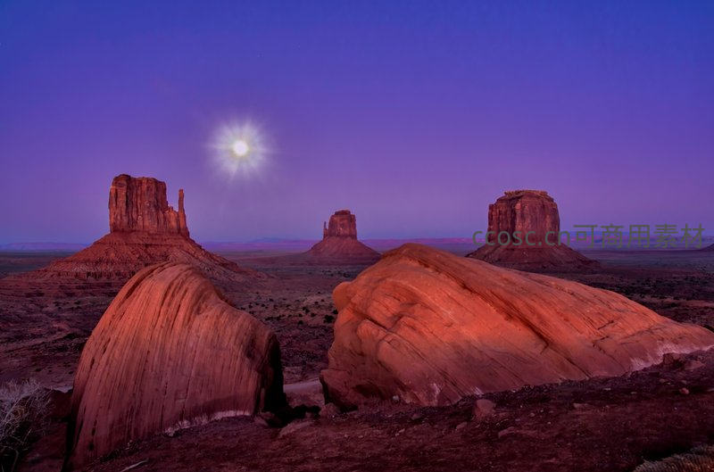 夜幕降临,满月高悬于纪念碑谷上空,散发耀眼星芒,紫色渐变天幕映衬三座标志性砂岩柱,前景风化岩丘被月光与地表余晖染成暖橙色,冷暖对比强烈,展现荒漠夜晚的神圣与静谧力量。
