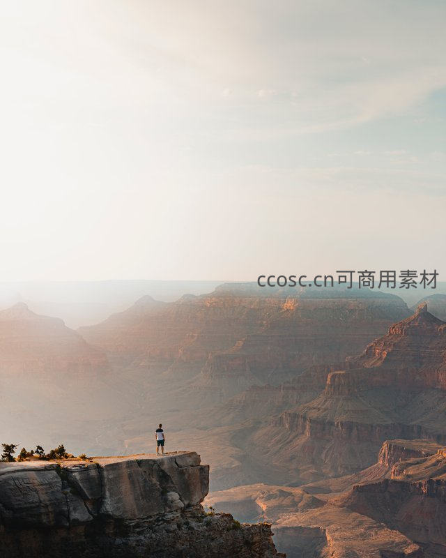 一人独立于大峡谷边缘岩台之上,背对镜头凝望辽阔层叠的红岩峡谷,暖光洒落勾勒出地貌褶皱与纵深感,凸显人类渺小与自然伟力的对比,充满哲思与敬畏之情。