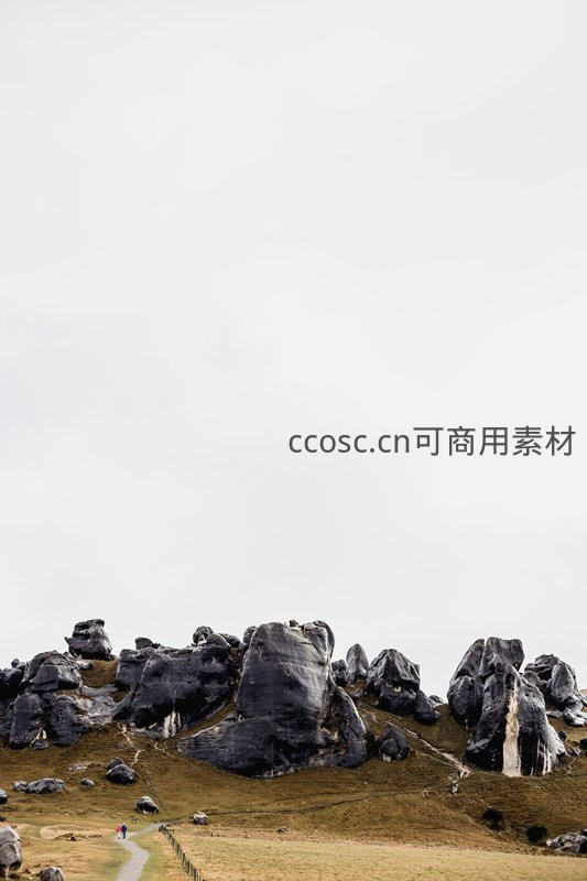 灰白天空下,形态奇特的黑色柱状玄武岩群矗立于枯黄草坡之上,一条蜿蜒小径穿行其间,远处可见微小行人身影,展现原始粗犷的地貌力量与人类探索的谦逊足迹。