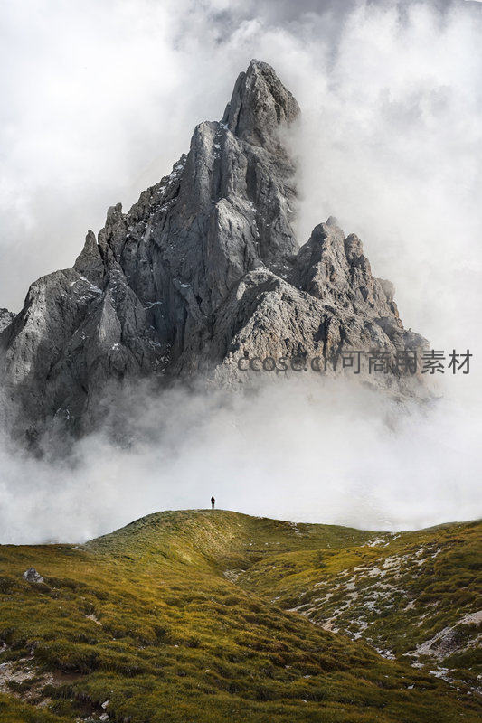 阿尔卑斯山脉某处险峻岩峰穿云而出,灰白岩壁嶙峋锐利;山腰绿茵草甸上一人渺小伫立,四周云雾翻涌流动,光影变幻间凸显自然伟力与人类敬畏之心。