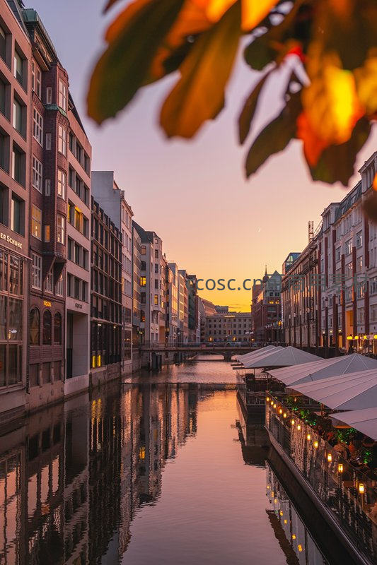 黄昏运河城市街景,秋叶前景映衬两岸建筑倒影