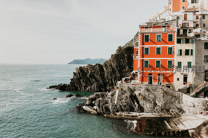 里奥马焦雷海岸红屋,岩崖嶙峋直插碧海,远山隐约天际线
