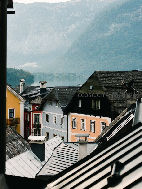 从高处俯视奥地利哈尔施塔特湖畔小镇,五彩斑斓的木筋房与深色斜顶错落有致,背景是云雾轻笼的翠绿山峦与澄澈湖泊,前景金属屋脊形成几何引导线,构成经典阿尔卑斯风情画卷。