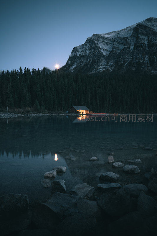 暮色中,一轮明月高悬雪峰之巅,湖面如镜倒映亮灯小屋与苍翠针叶林;近处石滩错落,水波微漾,营造出宁静致远的高山秘境氛围。