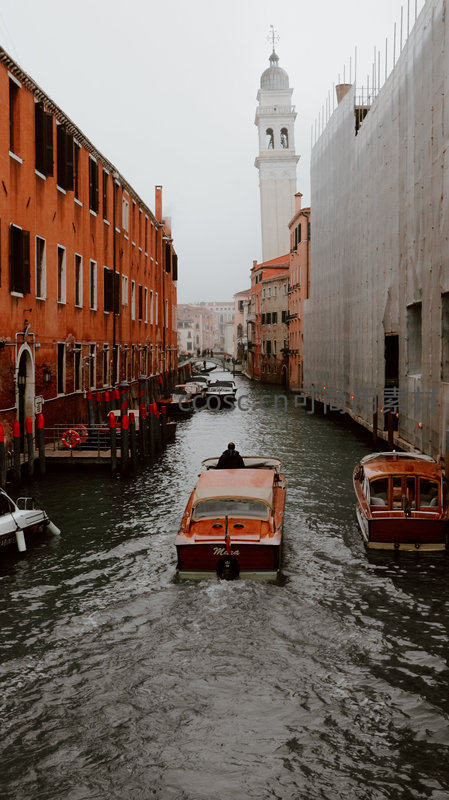 阴雨微雾笼罩下的威尼斯水巷,橙红色小艇载客缓缓前行,两侧是斑驳的赭色老屋与临时围挡,远处圣马可钟楼若隐若现,水面泛起涟漪,尽显水城独有的湿漉浪漫与历史沧桑。