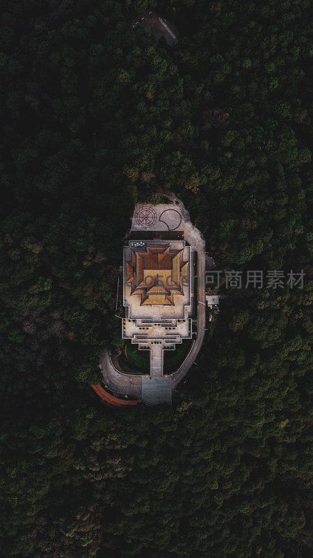 航拍森林深处中式古寺屋顶与庭院布局的对称美学