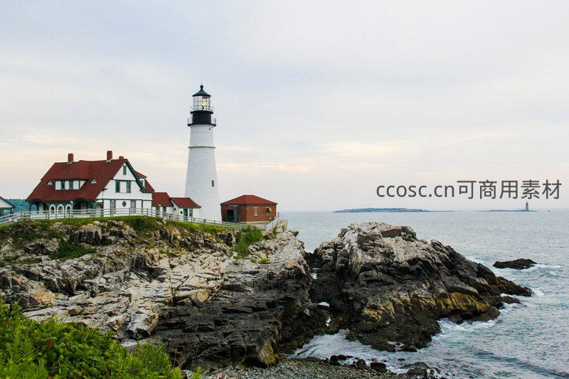 美国缅因州波特兰角灯塔矗立在崎岖花岗岩海岸线上,红瓦白墙的守塔人住所与高耸灯塔相映成趣,远处海面波光粼粼,另一座灯塔隐约可见,展现经典新英格兰海岸风貌。