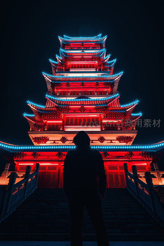 夜晚中式多层宝塔被红蓝LED灯带环绕,层层飞檐在黑暗中熠熠生辉,前景一人背影伫立台阶仰望,营造神秘庄严又现代炫酷的视觉张力,融合传统与当代美学。