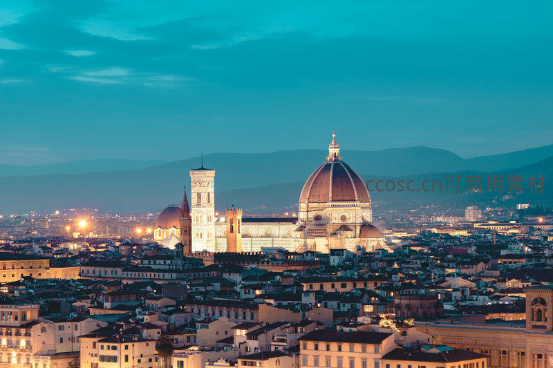 佛罗伦萨黄昏全景,圣母百花大教堂穹顶辉映城市灯火