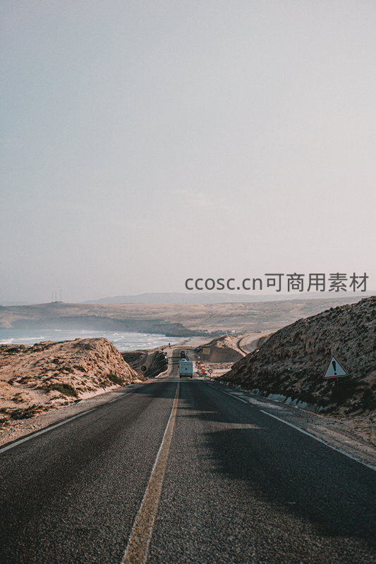 荒漠海岸公路延伸至远方,白色货车行驶在空旷沥青路上