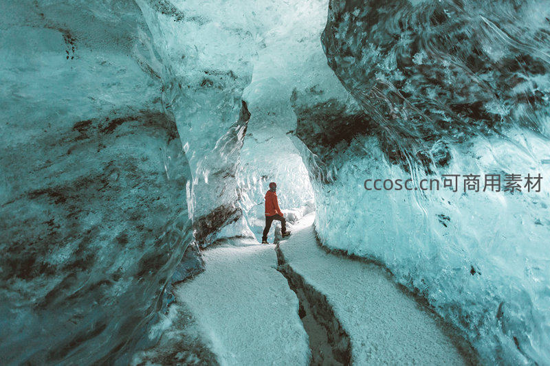 冰洞探险者穿行于晶莹剔透的蓝色冰川隧道中