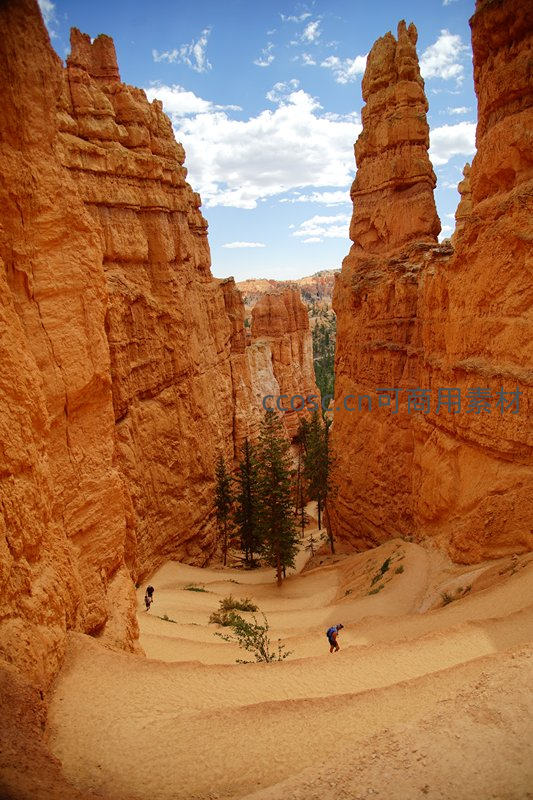 布莱斯峡谷橙红岩柱林立,游客穿行于砂岩迷宫间
