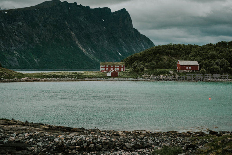 灰云低垂下,清澈碧绿的峡湾水面映衬着两座传统红色木屋,屋顶覆青苔,背景陡峭山峦苍翠,前景碎石滩延伸,呈现北欧特有的冷峻诗意与生活气息。