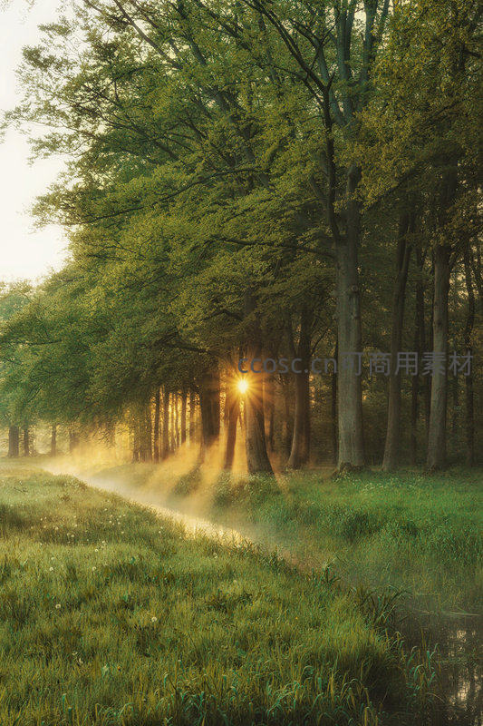 晨雾林间小径阳光穿透树影如星芒