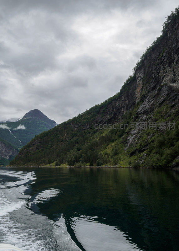 阴云密布下,挪威壮丽峡湾展现深邃静谧之美:高耸陡峭岩壁覆满翠绿植被,远处山峰隐现薄雾,近处船行留下的白色尾迹在墨绿水面荡漾,构成层次丰富的自然画卷。