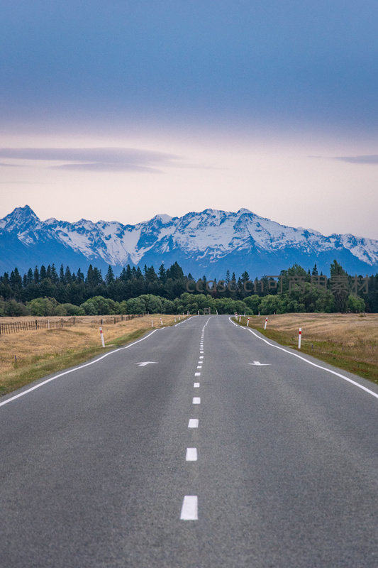 新西兰南岛空旷公路直通雪山,两侧草原树林延伸至天际线