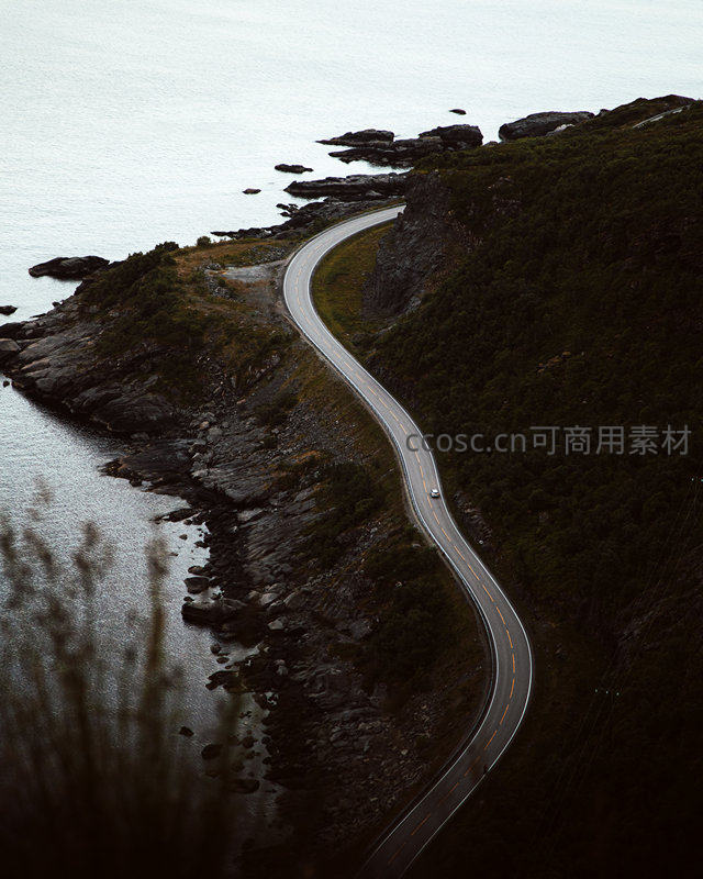高空俯瞰视角下,一条S形沥青公路紧贴陡峭岩岸延伸入海,一辆白色小车孤独行驶其间,碧海、黑岩、翠林交织,构成壮丽而孤寂的北欧海岸画卷。