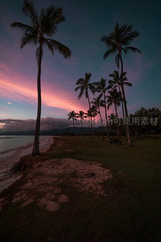 广角镜头下,高耸椰树群以深色剪影矗立于翠绿草坪边缘,左侧浅滩轻拍细浪;天空被粉紫橙红云层渲染,远山隐现轮廓,营造出温暖、诗意的热带黄昏意境。
