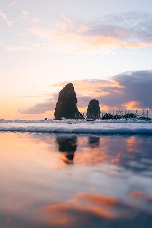 两座雄伟海蚀柱矗立浅海中,被柔和晚霞染成暖橙色;前景湿润沙滩映出清晰倒影,浪花轻抚岸边,云层透出粉紫渐变,营造出空灵而浪漫的滨海黄昏意境。