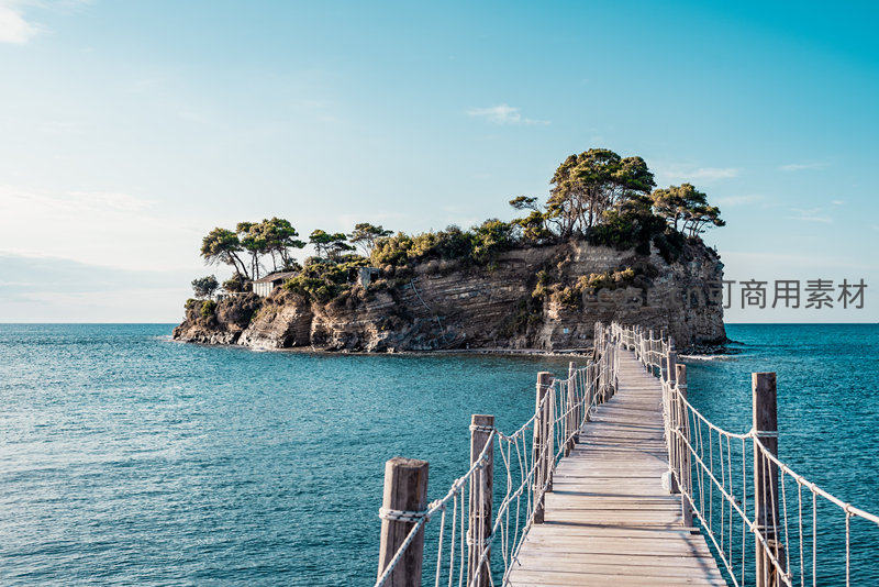 木栈道通向孤岛岩礁,碧海蓝天映衬地中海风情小岛