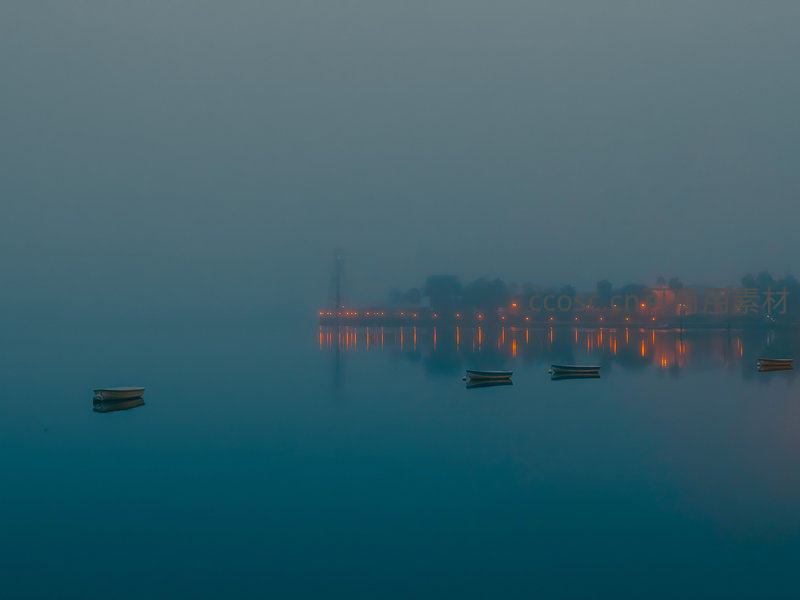 晨雾湖面孤舟点点,远岸灯火倒影如星