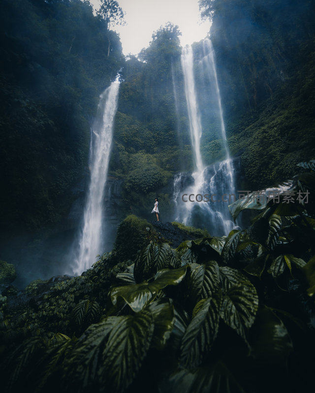 热带雨林深处双瀑飞泻,白衣旅人静立观景台