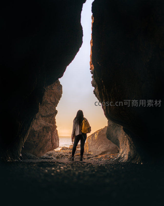 从幽暗洞穴内部向外望去,女子背影携黄背包伫立洞口,迎向金色海面与霞光;粗粝岩壁形成天然画框,明暗对比强烈,凸显自然雕琢之力与人类探索精神。