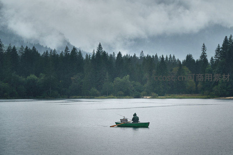 阴雨绵绵的山间湖泊上,一位身披绿色雨衣的垂钓者独坐小舟,手持钓竿静候;背景针叶林浓密深邃,云雾低垂缠绕山腰,水面泛起细密涟漪,营造出孤寂而沉思的东方水墨意境。