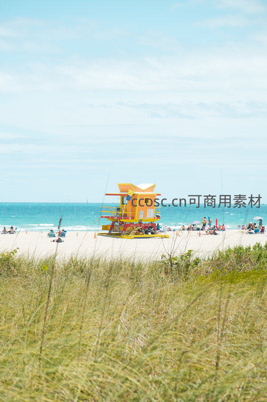 前景金黄草丛虚化衬托下,标志性的橙黄Art Deco风格救生塔矗立白沙之上,游客悠闲休憩,蔚蓝海水与晴空相接,尽显迈阿密南海滩活力与复古美学交融的度假魅力。