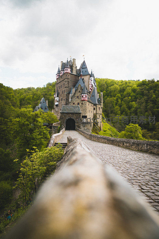 德国埃尔茨城堡航拍:石桥通向森林中的中世纪古堡
