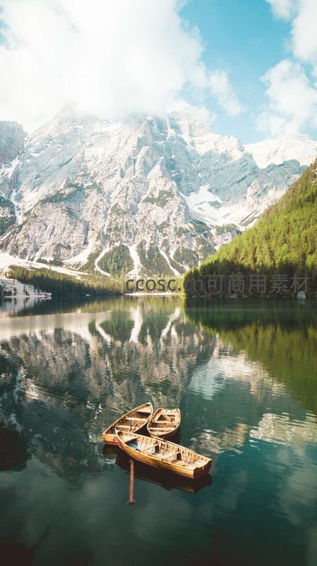 阿尔卑斯湖畔晨雾轻笼,三艘木舟静泊碧水,雪山倒影如画