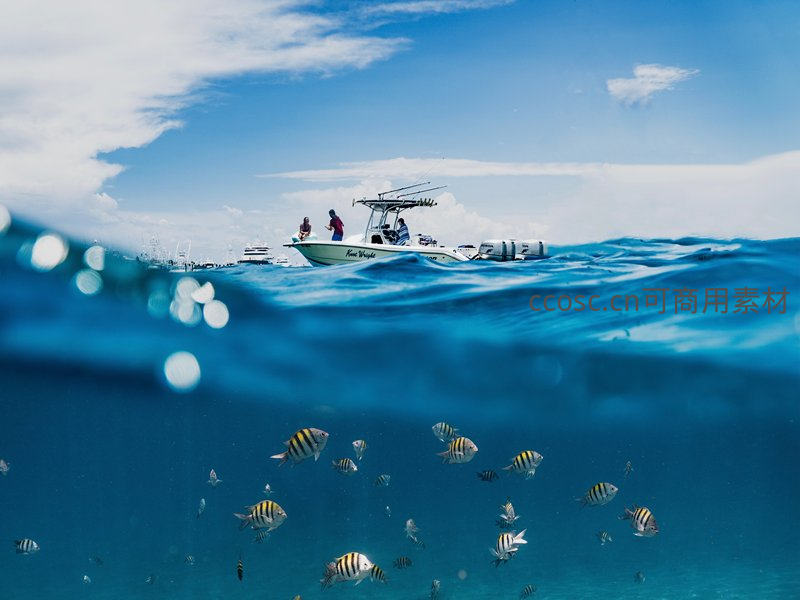 镜头横跨海面分界线,上半部蓝天白云下白色渔船载人巡航,下半部清澈碧水中一群条纹热带鱼自由游弋;气泡升腾、光影折射交织,生动呈现海洋表层活动与水下生态系统的和谐共生,充满活力与科学美感。