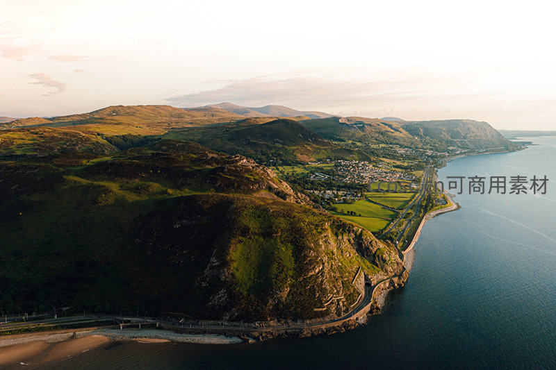 高空视角下,连绵起伏的翠绿丘陵紧邻深蓝海湾,一条沿海公路如丝带般缠绕山脚,村落点缀其间,夕阳余晖为大地镀上金边,气势恢宏。