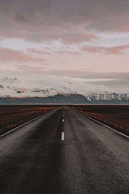 笔直沥青路延伸至地平线,两侧是广袤黑色火山砂原,远方连绵雪峰在粉紫晚霞映衬下静默矗立;空旷道路象征探索与自由,呈现冰岛极致简约而震撼的自然美学。
