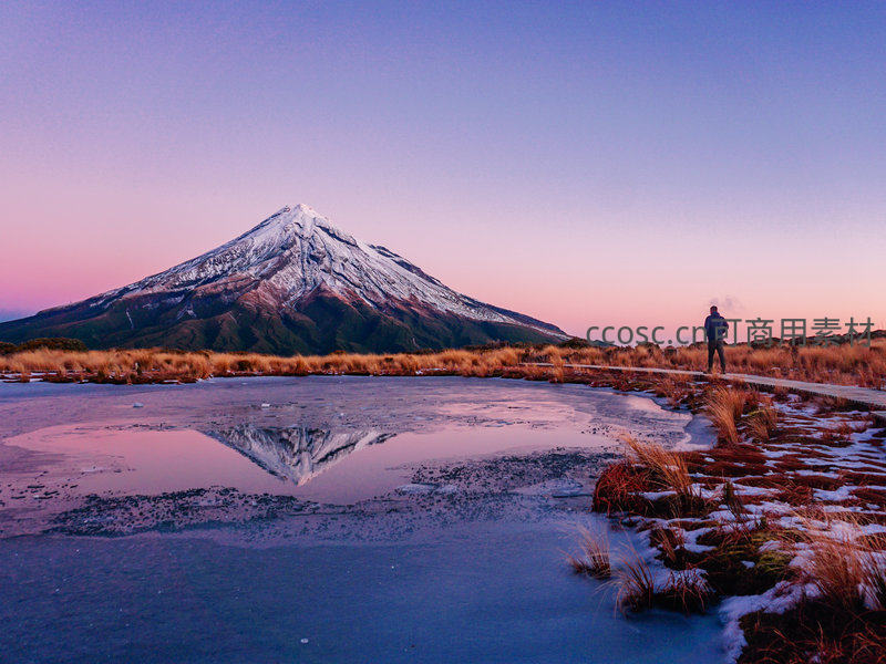 新西兰塔拉纳基山在粉紫暮光下银装素裹,其完美锥形轮廓清晰倒映于半结冰的湖面,一名游客伫立木栈道远眺,枯草与薄雪点缀前景,构成宁静而震撼的自然画卷。